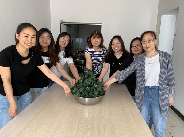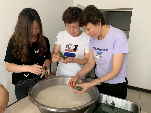 上午9點(diǎn),粽葉、糯米、大棗整齊地?cái)[上桌。大家邊包邊聊,其樂融融。在包粽子現(xiàn)場(chǎng),熟悉包粽子的能手們飛快地拿起粽葉,兩手一窩卷成漏斗狀,填米、加棗、壓緊、扎繩,一氣呵成。她們還充當(dāng)起“老師”的角色,教“新手”職工包粽子,手把手現(xiàn)場(chǎng)教學(xué),“老師”教得仔細(xì),“學(xué)生”學(xué)得認(rèn)真,但要做出餡料十足、外觀漂亮的粽子還是需要費(fèi)一番功夫的。隨著技巧的不斷嫻熟,一個(gè)多小時(shí)的時(shí)間,形狀各異、大小不一的一百多個(gè)粽子就堆積成山了,預(yù)算科副科長(zhǎng)竇夢(mèng)娜說:“我們包粽子的水平真是越來越高了,明年再包會(huì)更好!”此時(shí)每個(gè)人心里都洋溢著一股喜悅之情,有初學(xué)一門手藝的欣喜,有參與集體活動(dòng)交流感情的滿足。