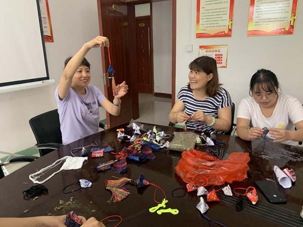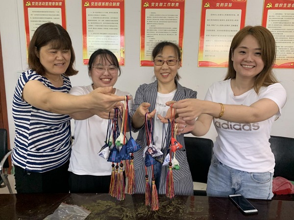 在傳統(tǒng)習(xí)俗中,玲瓏可愛的各色香包也是端午節(jié)必不可少的元素。包完粽子后大家轉(zhuǎn)移陣地到了活動(dòng)室,大家圍坐桌邊,面前堆放著一份份材料包,有棉布、艾草、針線、中國結(jié)流蘇。面對(duì)這個(gè)從來沒有做過的DIY,大家開始研究起來,有的用手機(jī)搜索縫制方法流程,有的直接比來比去親自摸索著縫起來。有職工說:“這有點(diǎn)像咱們小時(shí)候老人們縫的毽子,那個(gè)里面裝的是五谷雜糧,咱們現(xiàn)在裝的是艾草。”“這香囊可以掛在辦公室或者車上,有清香、驅(qū)蚊的功效。”“我算是知道了,這個(gè)流蘇應(yīng)該縫在這個(gè)邊的中間,而不是角上……”大家你一句我一句,手中的針線穿梭在棉布間,用密密的針腳縫制出傳統(tǒng)佳節(jié)最好的注解,用絲絲線線纏繞出端午安康的美滿寓意,一個(gè)個(gè)精巧可愛的三角香囊在大家的努力下完美呈現(xiàn)。