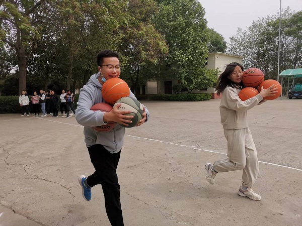 “誰先來?抱球游戲升級——1人抱4個籃球向前奔跑,過程中一個球也不得落地,否則成績無效。”裁判之一的審計科長談增迫不及待地宣布。“個子高的胳膊、腿長,有優(yōu)勢,先上。”人群里有人提議,工程科身高一米八的帥小伙劉文浩和綜合辦高個子王春影舉手示意,跑道上呈現(xiàn)二人灑脫、漂亮的抱球姿勢。