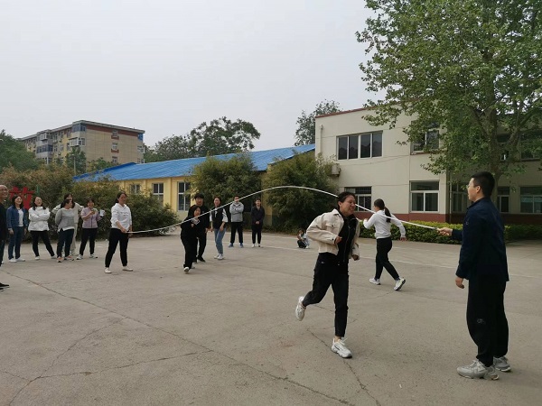 “來,你抱著球,我抱著你的胳膊,保持邁出的腳步速度一致。”綜合辦副主任李萬岐一邊跟警衛(wèi)室韓小樂說著,一邊開啟了兩人一組的螃蟹賽跑——兩人背對背夾住著的1個籃球,在50米的賽道上,走到過半,球就落地了,大家笑得前仰后合,兩人也笑得顧不得夾起球繼續(xù)……