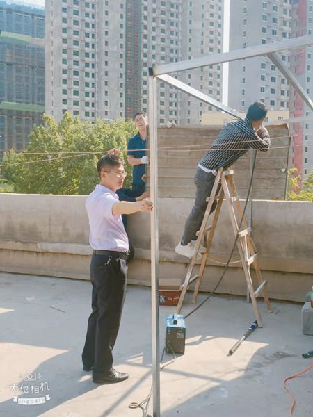 說(shuō)干就干,立即行動(dòng)。劉保國(guó)和左建華對(duì)樓頂平臺(tái)實(shí)地量測(cè),記錄好尺寸。兩人一邊量著,一邊比劃著,對(duì)所需的材料做到心中有數(shù)。“采購(gòu)材料的事兒,就交給我了。”設(shè)備材料科科長(zhǎng)史永濤拿出電話就開(kāi)始聯(lián)系起來(lái)。材料就位后,考慮到有些電焊的活兒需要專業(yè)的工人,劉保國(guó)趕緊聯(lián)系了一名電焊工。大家分工合作,你遞材料、我扶鋼管,你安裝、我綁線,邊干邊聊。30多度的高溫下,大家的額頭上直冒汗,但干勁兒絲毫沒(méi)減。防雨棚安裝完畢,新買(mǎi)的洗衣機(jī)放置到位,大家松了一口氣。“今天的大工程結(jié)束了,趁著這次機(jī)會(huì),咱們把宿舍的門(mén)窗都檢查一遍。”劉保國(guó)說(shuō)道,抬手擦了擦汗水,便拿起工具向宿舍走去。大家對(duì)宿舍的門(mén)窗逐一進(jìn)行檢查,對(duì)破洞的紗窗進(jìn)行了更換,對(duì)門(mén)上松動(dòng)的把手進(jìn)行了維修。