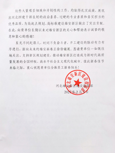 2021年2月下旬,公司收到雄安新區(qū)建設(shè)指揮部感謝信,信中就公司對雄安新區(qū)建設(shè)的支持幫助表示感謝,對選派到雄安新區(qū)工作的王現(xiàn)峰、孫文超同志給予高度肯定。