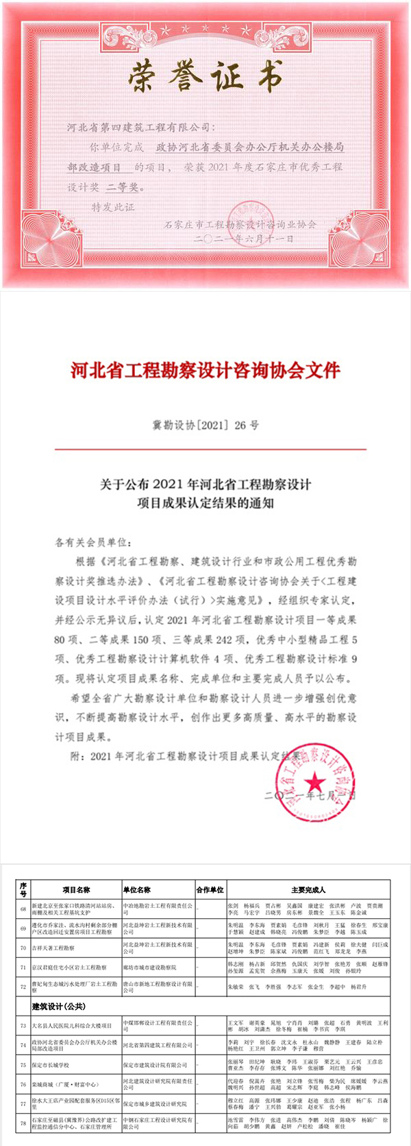 7月5日,公司設計院收到榮譽證書和文件,《政協(xié)河北省委員會辦公廳機關(guān)辦公樓局部改造項目》獲2021年石家莊市優(yōu)秀工程設計獎二等獎、河北省工程勘察設計項目成果獎三等獎。