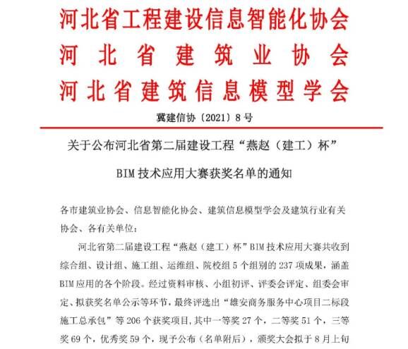 據悉,本次大賽由河北省工程建設信息智能化協會、河北省建筑業(yè)協會、河北省建筑信息模型學會共同舉辦,共收到237項參賽成果,最終評選出一等獎27個,二等獎51個,三等獎69個,優(yōu)秀獎59個。此次獲獎,充分展現了公司BIM技術應用水平和實力,彰顯了企業(yè)品牌形象。(BIM中心)