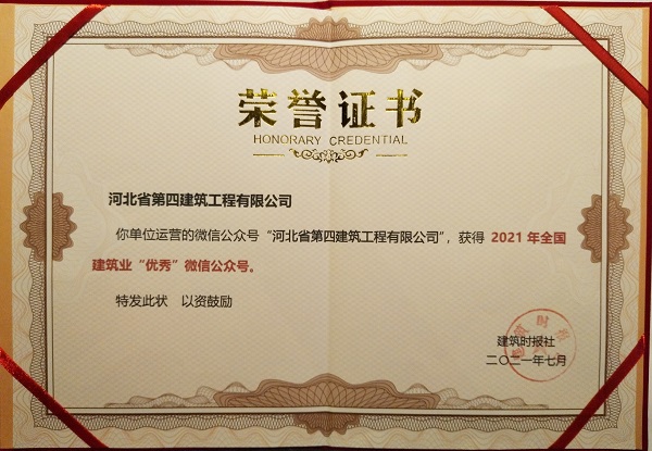 7月16日,在“2021建筑業(yè)微信公眾號(hào)運(yùn)維經(jīng)驗(yàn)交流研討會(huì)暨全國(guó)建筑業(yè)優(yōu)秀公眾號(hào)頒獎(jiǎng)典禮”上,公司微信公眾號(hào)“河北省第四建筑工程有限公司”被評(píng)為“2021年全國(guó)建筑業(yè)優(yōu)秀微信公眾號(hào)”。