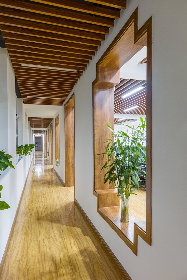 由于辦公區(qū)裸露門洞窗洞較多,極具藝術(shù)感,于是在設(shè)計風(fēng)格方面設(shè)計師借鑒了中式古典花窗元素,將四個窗洞設(shè)計為不同造型,曲直轉(zhuǎn)折均一絲不茍,淋漓盡致地展現(xiàn)出中式古典花窗的特點,使得簡潔的空間多了一絲東方韻味。這樣舒適雅致的辦公環(huán)境更能激發(fā)設(shè)計師的創(chuàng)作靈感,讓設(shè)計師創(chuàng)作出更好的設(shè)計作品。