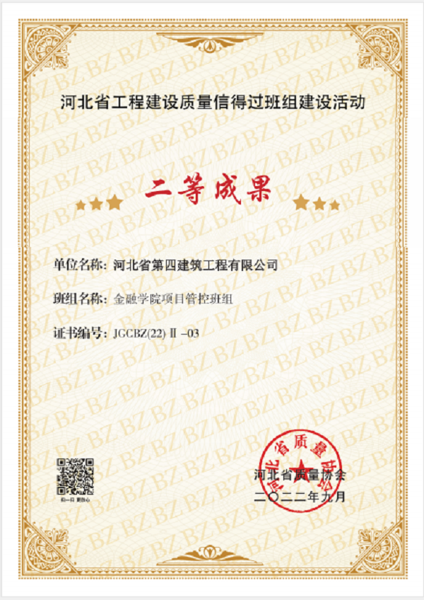 9月16日,六分公司收到了河北省質(zhì)量協(xié)會頒發(fā)的證書,河北金融學院項目管控班組榮獲“河北省工程建設(shè)質(zhì)量信得過班組建設(shè)活動”二等成果,并被推薦到中國建筑業(yè)協(xié)會交流。