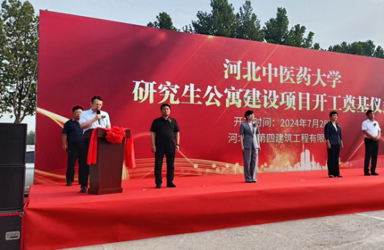 奠基儀式現(xiàn)場,挖掘機、裝載機身披大紅花整齊排列,猶如即將出征的戰(zhàn)士,工人整裝待發(fā),信心滿滿、斗志昂揚。儀式在歡快激昂的樂曲聲中拉開序幕。主持人首先介紹了參加本次儀式的相關(guān)領(lǐng)導和項目概況。隨后,唐志強作為施工單位代表首先發(fā)言,“我公司有幸承接該施工任務(wù),充分體現(xiàn)了項目主管部門和建設(shè)單位對我們國有建筑企業(yè)的信任和支持。河北四建一定高標準、嚴要求,為項目順利實施提供有力保證,為業(yè)主提供滿意服務(wù),為河北中醫(yī)藥大學醫(yī)學教育的高質(zhì)量發(fā)展貢獻力量!”最后,學校黨委副書記孫士江表示,河北中醫(yī)藥大學研究生公寓為省政府支持骨干大學建設(shè)項目,希望參建各方全力以赴確保按時完工投入使用,建設(shè)“品質(zhì)工程”“一流工程”,促進學校各項事業(yè)取得新成就,為經(jīng)濟強省、美麗河北建設(shè)作出新的更大貢獻!