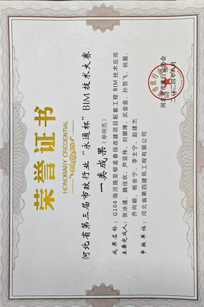 8月16日,七分公司收到了河北省市政行業(yè)協(xié)會頒發(fā)的榮譽證書。分公司參賽的“G104海河路至柳孟春段改建項目配套工程BIM技術(shù)應(yīng)用”成果,在河北省第三屆市政行業(yè)“永通杯”BIM應(yīng)用技能大賽中被評為一類成果。
