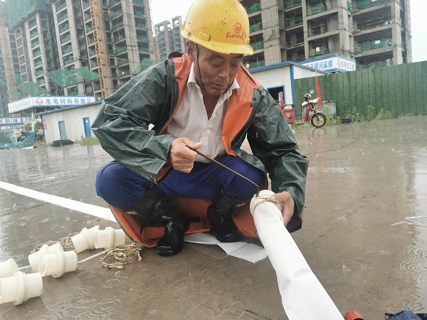 針對因強(qiáng)降雨導(dǎo)致項(xiàng)目部分地區(qū)已出現(xiàn)的積水,項(xiàng)目部立即組織人員在不同房號、洞口分別用10余臺潛水泵進(jìn)行抽水,做到“隨下隨排”,避免因積水問題影響項(xiàng)目進(jìn)度。