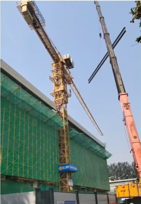 “大臂往右,慢一點(diǎn)……”塔吊下,信號(hào)工通過(guò)對(duì)講機(jī)指揮塔吊緩慢旋轉(zhuǎn)避讓。隨后,負(fù)重吊車(chē)精準(zhǔn)、平穩(wěn)地將鋼梁吊裝到施工區(qū)。