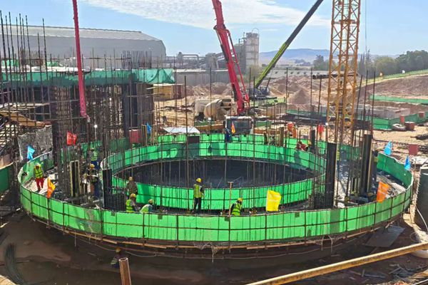 全體職工以昂揚(yáng)斗志和實(shí)干作風(fēng),搶抓施工黃金期。在生料均化庫的施工現(xiàn)場(chǎng),一場(chǎng)驚心動(dòng)魄的“滑模攻堅(jiān)戰(zhàn)”正成為項(xiàng)目建設(shè)的焦點(diǎn)。生料均化庫作為項(xiàng)目核心儲(chǔ)料設(shè)施,施工精度要求較高,庫體垂直度誤差需控制在毫米級(jí),模板支護(hù)和混凝土澆筑難度遠(yuǎn)超常規(guī)工程。項(xiàng)目主管工程師帶領(lǐng)管理人員,白天實(shí)測(cè)數(shù)據(jù)、勘察作業(yè)面,晚上對(duì)照南非當(dāng)?shù)匾?guī)范和國際標(biāo)準(zhǔn),反復(fù)測(cè)算模板支護(hù)的受力參數(shù),優(yōu)化澆筑方案。為確保施工精度,每次澆筑前,他會(huì)組織相關(guān)人員逐一排查支架、模板的受力點(diǎn)分布情況,同時(shí)采用高精度定位儀實(shí)時(shí)監(jiān)測(cè),創(chuàng)新采用“智能測(cè)控、定向分析、實(shí)時(shí)調(diào)整”工藝,嚴(yán)格控制混凝土配合比和澆筑速度,確保庫體垂直度的精準(zhǔn)。